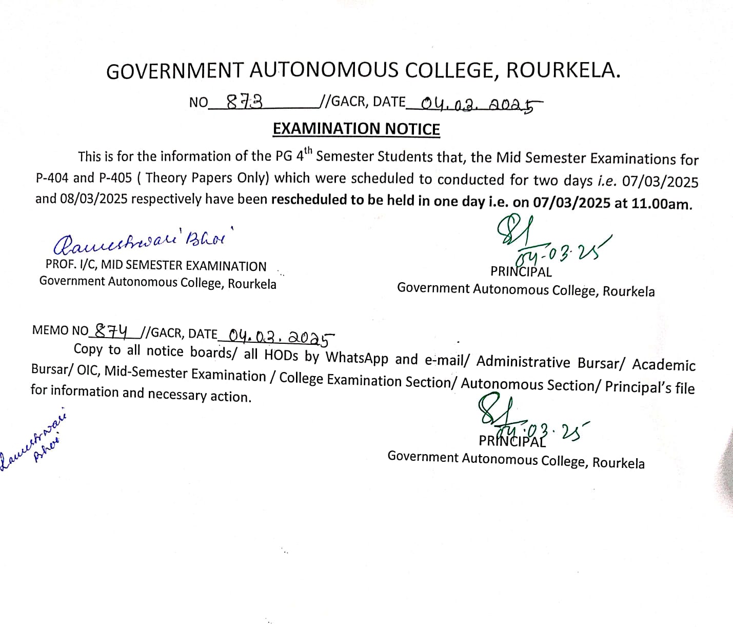 Mid-Sem Examination Rescheduled notice for P-404 & P-405 (Theory Papers)