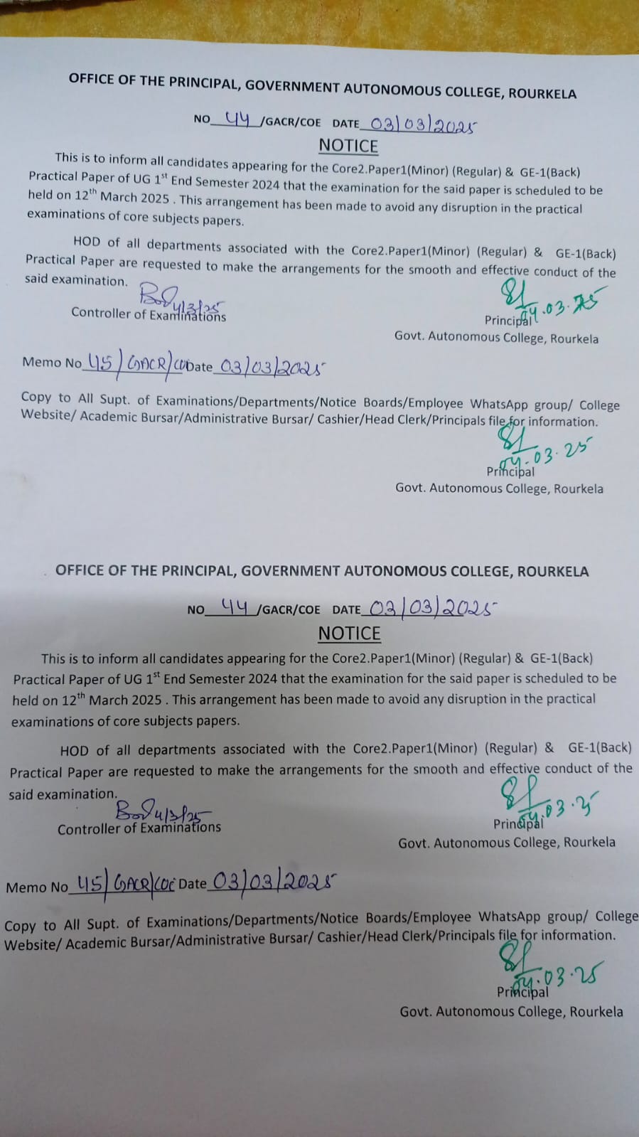 Core2. Paper-1 (Minor) & GE-1 (Back) Practical Paper of UG 1st End Semester Practical Examination Notice