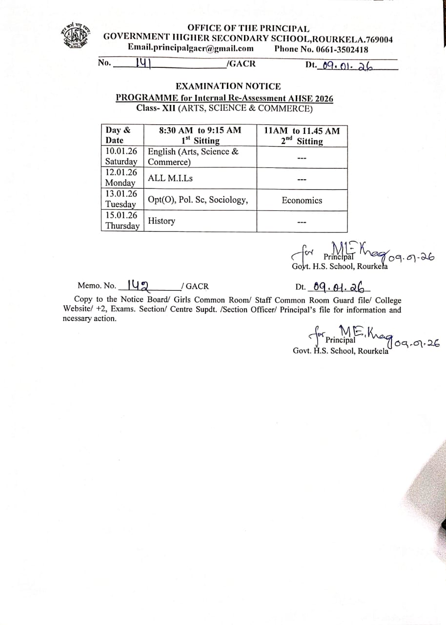 Programme for Internal Re-Assessment AHSE-2026, Class XII (Arts/ Science/ Commerce)