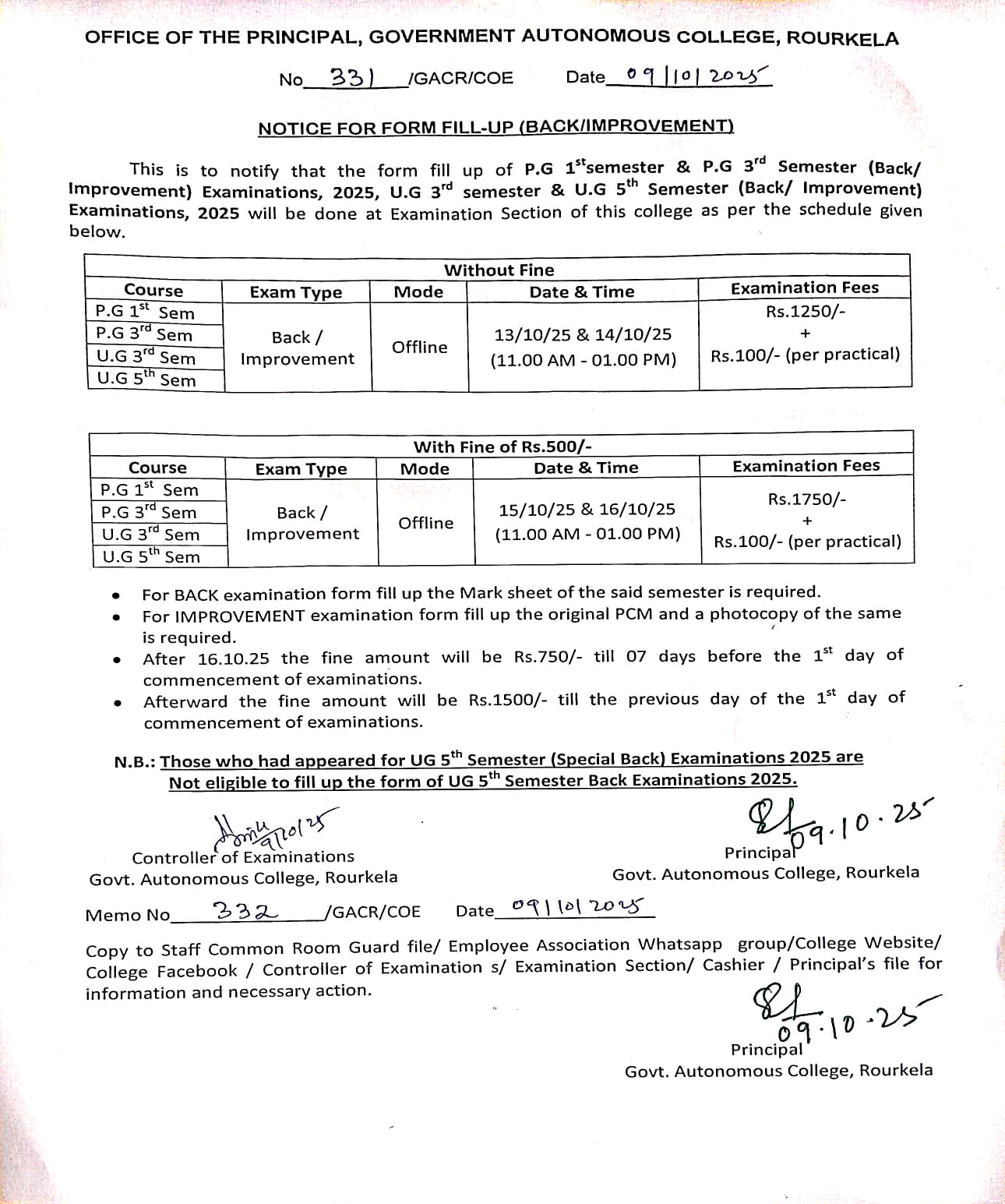 Form fill-up notice for PG 1st/PG 3rd Sem and UG 3rd/ UG 5th Sem (Back/Improvement)Examination, 2025