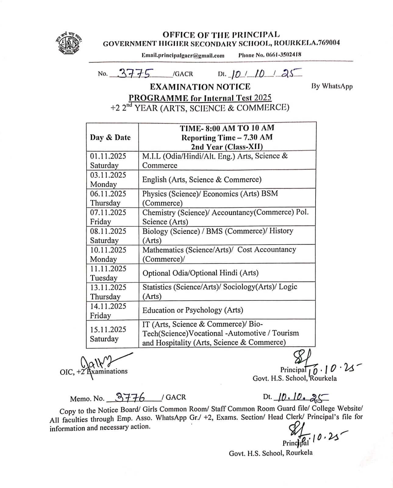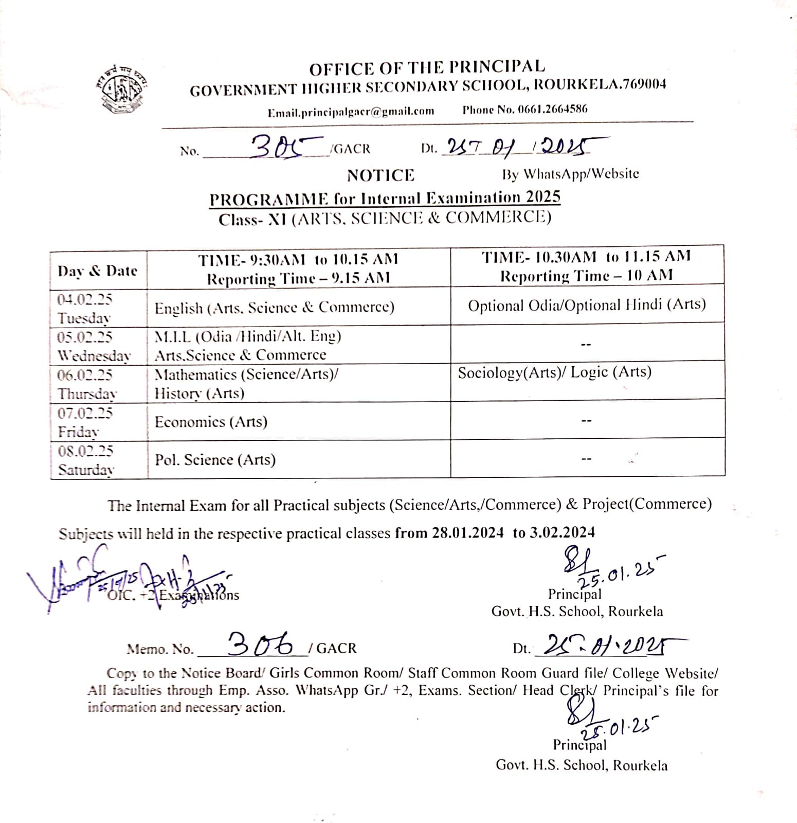 Programme for Internal Examination 2025 (Class XI, Arts/ Science/ Commerce)
