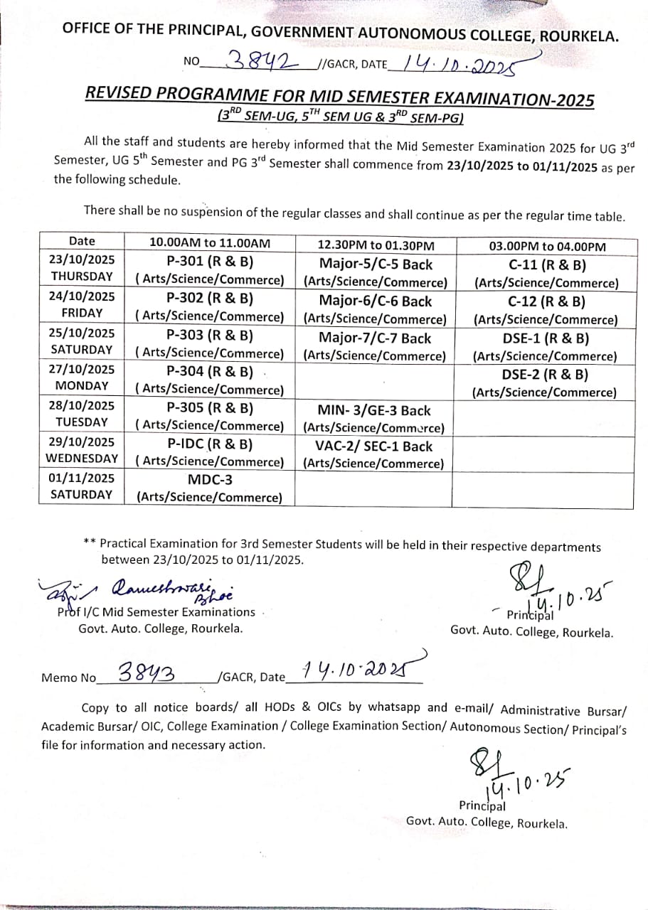 Revised Mid Sem examinaion notice for UG 3rd, UG 5th and PG 3rd Semester Students