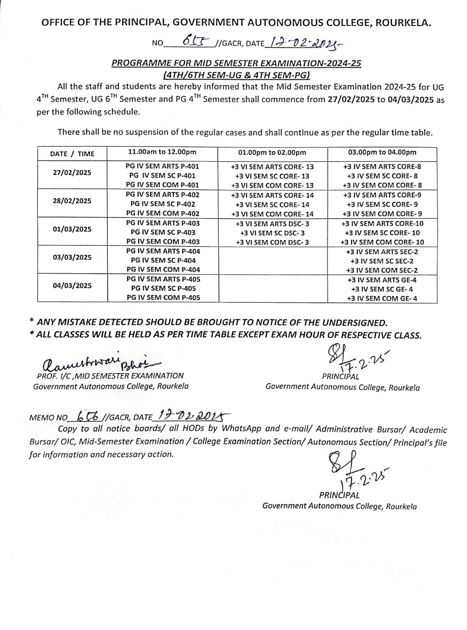 Revised Programme For Mid Semester Examination 2024-25 (UG 4th/ UG 6th & PG 4th Sem)