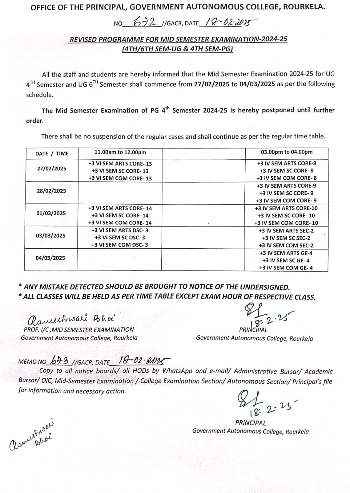 REVISED Programme for Mid Semester Examination-2025 (2nd Sem-UG & 2nd Sem-PG)