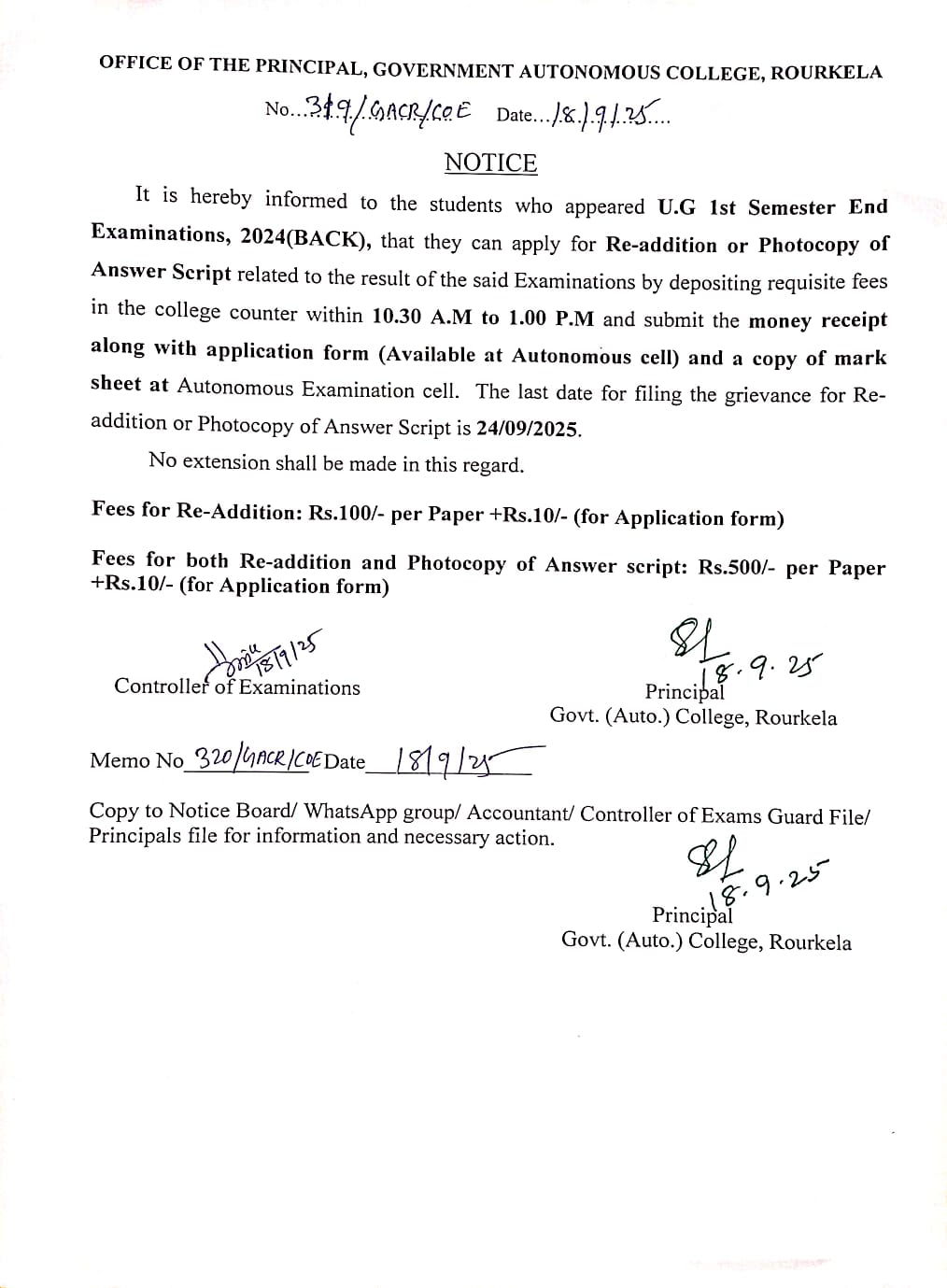 Readdition or Photocopy of Answer Script Notice for UG 1st Semester End Examinations, 2024 (BACK)