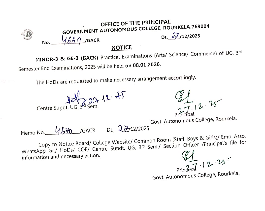 UG 3rd Semester Minor-3 & GE-3 (Back) Practical Examination Notice
