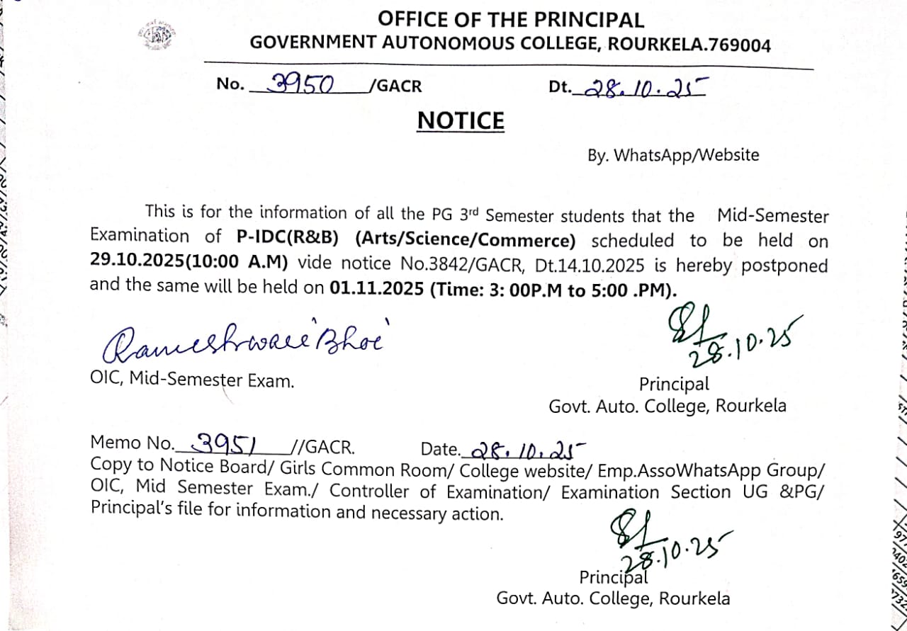 Mid Sem Examination 2023-24 for UG 3rd Sem/ UG 5th Sem and PG 3rd Sem Scheduled for the date 28-09-2023 is hereby postponed to 29-09-2023