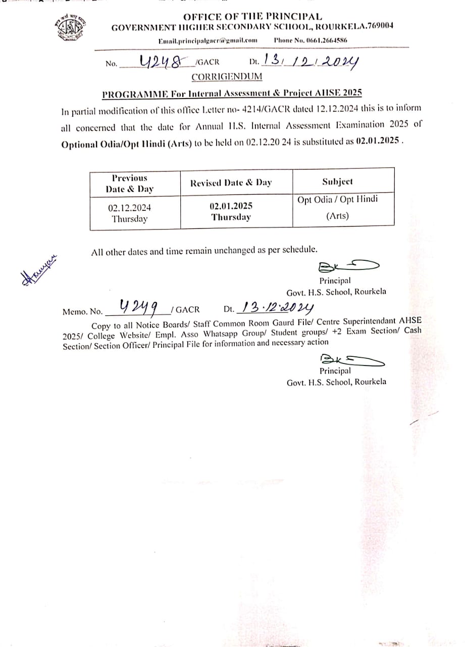 Corrigendum of Programme For Internal Assessment & Project AHSE, 2025