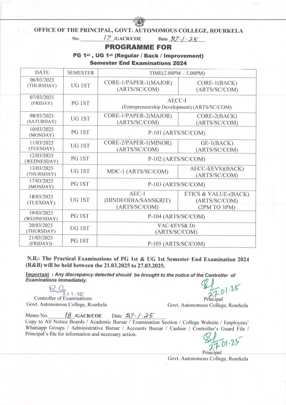 Programme For PG 1st, UG 1st Semester End Examination 2025 (Regular/ Back/ Improvement)